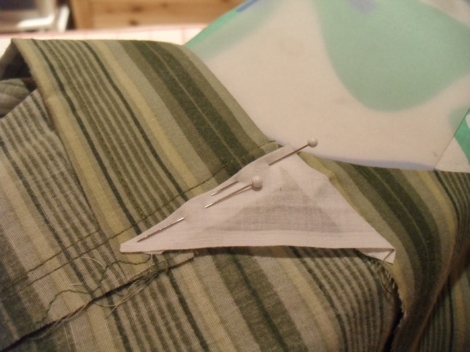 I had to pick a point on the stripes that I could use as 'true north' to even attempt to get that diamond shape match on the front skirt and bodice pieces. The pin is at that point, the top edge of the center of the front skirt panel, the little narrow yellow stripe in between the dark green ones. I will use that little yellow stripe as reference for the other bias bodice pieces.